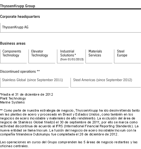 thyssenkrupp es un grupo industrial diversificado con fortalezas tradicionales en materiales y una creciente participación en bienes de equipo y servicios. Alrededor de 155.000 empleados en casi 80 países trabajan con entusiasmo y amplia experiencia desarrollando soluciones y procesos industriales inteligentes para un progreso sostenible. Su cualificación y compromiso son la base de nuestro éxito. En el ejercicio económico 2014/2015, thyssenkrupp alcanzó una cifra de ventas de aproximadamente 43.000 millones de euros.